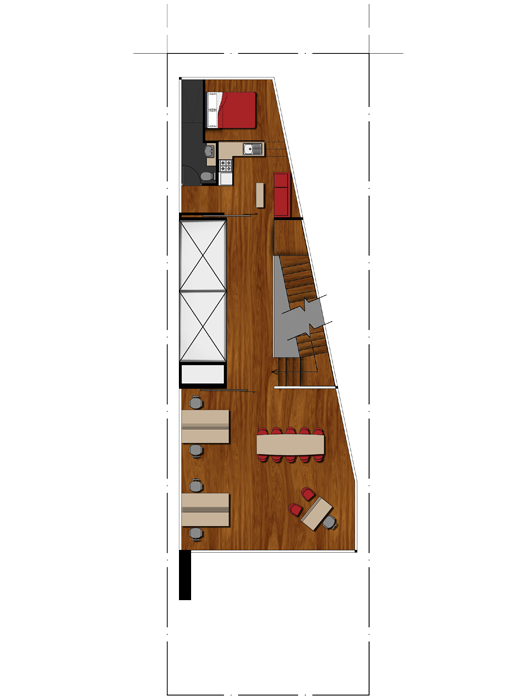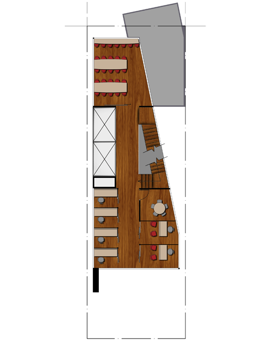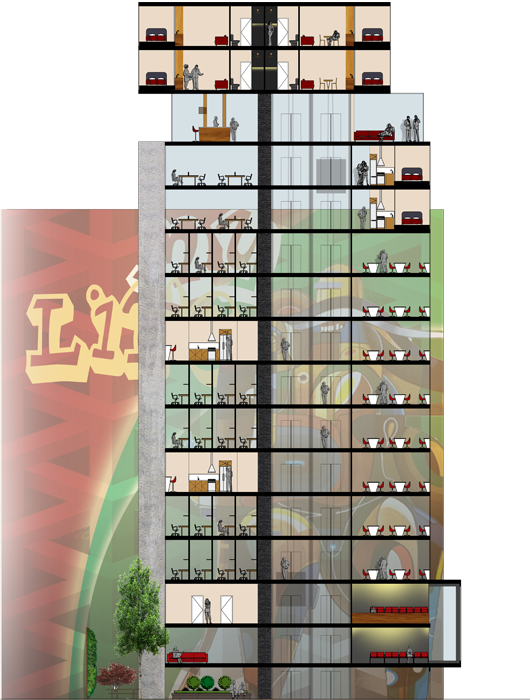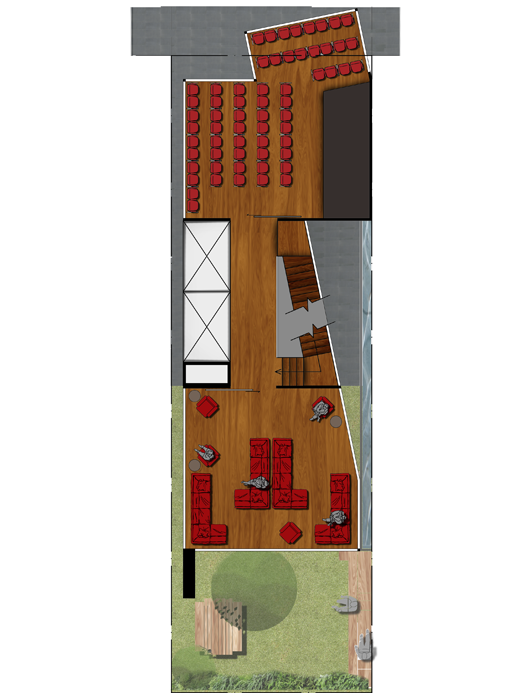 Throughout my design key words have driven the design into this sleek blade like form aiming to enhance natural and artificial lighting aspects. Seen below, a section provides the planned offset from the adjoining building’s exterior wall. Using this space as a lightwell and artificially lit at night, I discovered that light in psychological sense only needs to provide vibrance and ‘Life’. Therefore with enough popping colour, the adjoining wall will provide not only an array of interest light but a constant changing art form.